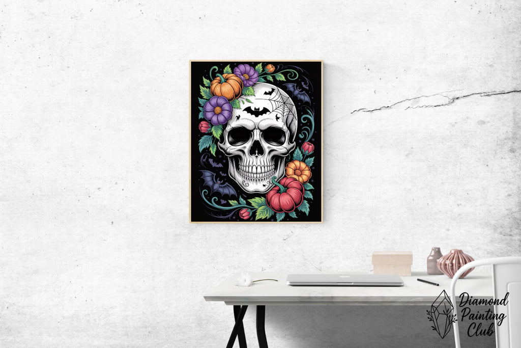 Ce motif de broderie diamant est une célébration colorée et macabre, parfaite pour l'esprit d'Halloween et du Dia de Muertos. Il présente un crâne stylisé, au centre d'une composition richement détaillée. Contrairement à une vision purement sombre, il est orné d'un luxuriant mélange de fleurs aux teintes vibrantes (mauve, rouge et orange) et de petites citrouilles, symbolisant le cycle de la vie et de l'automne. Des silhouettes de chauves-souris et une toile d'araignée discrète sont incrustées sur le front et le côté du crâne, soulignant le thème effrayant de la fête. Le fond noir profond fait ressortir l'éclat des couleurs et la blancheur du crâne. Ce design est un cocktail audacieux qui marie l'esthétique gothique à la beauté florale, offrant une pièce d'art diamantée à la fois chic et effrayante pour votre décoration d'Halloween.
