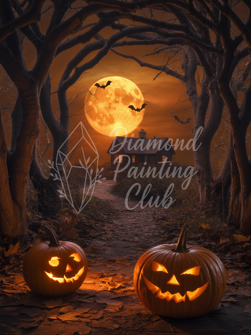 Ce motif de broderie diamant vous plonge au cœur d'une nuit d'Halloween intense et spectaculaire. La scène est encadrée par d'énormes arbres sombres et menaçants, formant un tunnel qui guide le regard. Au premier plan, deux imposantes citrouilles Jack-o'-lanternes irradient une lumière sinistre et chaleureuse le long du chemin de terre jonché de feuilles mortes. Au-dessus du chemin et d'une petite maison aux fenêtres allumées, trône une magnifique pleine lune d'un orange ardent, intensifiant les couleurs automnales et l'atmosphère mystique. Des silhouettes de chauves-souris planent devant la lune, ajoutant une touche classique d'effroi. Ce design est un cocktail vibrant et sombre qui capture parfaitement l'ambiance visuelle d'Halloween. Créez cette œuvre scintillante pour apporter une lumière ardente et un frisson joyeux à votre décoration saisonnière.