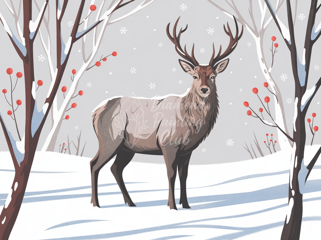 Plongez dans l'ambiance sereine d'un hiver stylisé avec notre broderie diamant, représentant un majestueux cerf aux bois imposants, se tenant avec calme au milieu d'un paysage enneigé. Son pelage aux nuances de brun et de beige contraste élégamment avec la pureté de la neige qui recouvre le sol et les branches des arbres dénudés. Des baies rouges vives parsèment les branches, ajoutant des touches de couleur éclatantes à ce tableau hivernal. Des flocons de neige stylisés flottent délicatement dans l'air, sous un ciel gris clair qui renforce l'atmosphère paisible. Cette toile est parfaite pour apporter une touche de quiétude, de nature et d'élégance à votre intérieur, idéale pour les amoureux des scènes hivernales et de la faune.