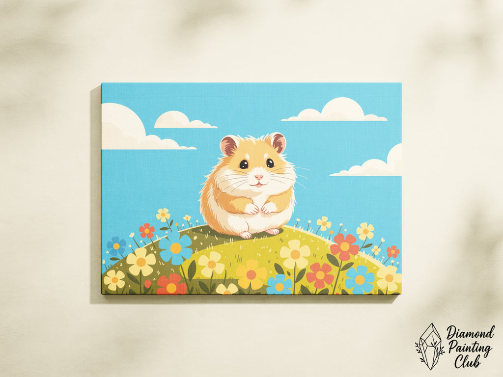 Éveillez votre intérieur avec la tendresse de ce motif de broderie diamant, capturant l'essence même de la joie printanière. Cette toile charmante représente un adorable hamster au pelage doux et aux yeux pétillants, confortablement installé sur une colline verdoyante parsemée de fleurs aux couleurs vives : rouges, jaunes, bleues et oranges. Sous un ciel azur parsemé de nuages cotonneux, cette scène respire la sérénité et la bonne humeur. L'expression paisible du hamster et l'ambiance bucolique invitent à la rêverie et à la douceur. Idéale pour apporter une touche de fraîcheur et de gaieté à votre décoration, cette œuvre en diamond painting est une véritable ode à la nature et à la simplicité des moments heureux.