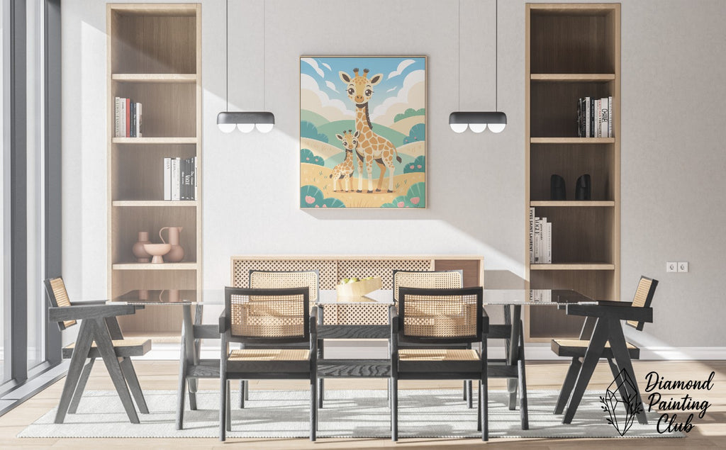 Laissez-vous émouvoir par la douceur de notre broderie diamant, illustrant une mère girafe et son petit, se tenant côte à côte avec tendresse. Leurs pelages aux motifs distinctifs, dans des tons de beige et d'orange, se détachent joliment sur un arrière-plan champêtre, parsemé de collines ondulantes aux nuances de vert clair et de beige. Un ciel bleu parsemé de nuages blancs apporte une sensation de sérénité, tandis que des touches de végétation et des fleurs roses en premier plan ajoutent de la vie et de la couleur à cette scène idyllique. Ce motif unique est parfait pour insuffler une ambiance de calme, d'amour familial et de la beauté de la faune africaine à votre intérieur.