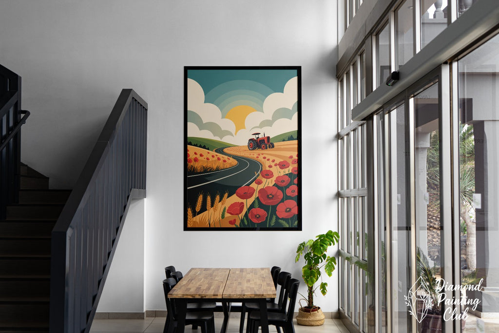 Ce motif de broderie diamant vous plonge dans une scène champêtre éclatante, dominée par un tracteur rouge vif au milieu de champs de blé doré et de coquelicots rouges, le tout baigné par les lueurs chaudes d'un soleil couchant. La route sinueuse, qui traverse le paysage, invite au voyage et à la contemplation de cette nature généreuse. Les nuages au-dessus, teints par les couleurs du crépuscule, ajoutent de la profondeur et du mouvement à cette composition idyllique. En assemblant chaque diamant, vous reproduirez les contrastes saisissants entre le rouge du tracteur et des coquelicots, le doré du blé, et les teintes douces du ciel. C'est une pièce idéale pour les amoureux de la vie rurale et des paysages apaisants, apportant une touche de chaleur et de sérénité à votre intérieur.