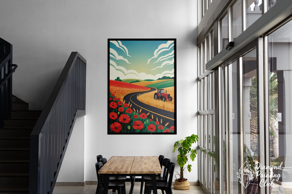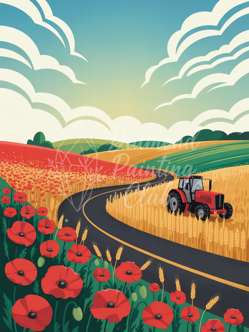 Ce motif de broderie diamant représente une illustration stylisée d'un tracteur rouge, symbole du travail agricole, avançant sur une route sinueuse au milieu de champs fertiles. Le paysage est vibrant de couleurs, avec des champs de blé doré et des parcelles de coquelicots rouges éclatants, créant un contraste visuel saisissant. Le ciel est parsemé de nuages expressifs, ajoutant du dynamisme à cette scène bucolique. La composition est conçue avec une esthétique moderne et épurée, mettant en valeur la beauté des paysages agricoles. En assemblant chaque diamant, vous donnerez vie aux différentes textures des champs et aux lignes fluides de la route, créant une œuvre qui célèbre la vie rurale. C'est une pièce idéale pour les amateurs de scènes champêtres et de design contemporain, apportant une touche de vitalité et d'authenticité à votre intérieur.